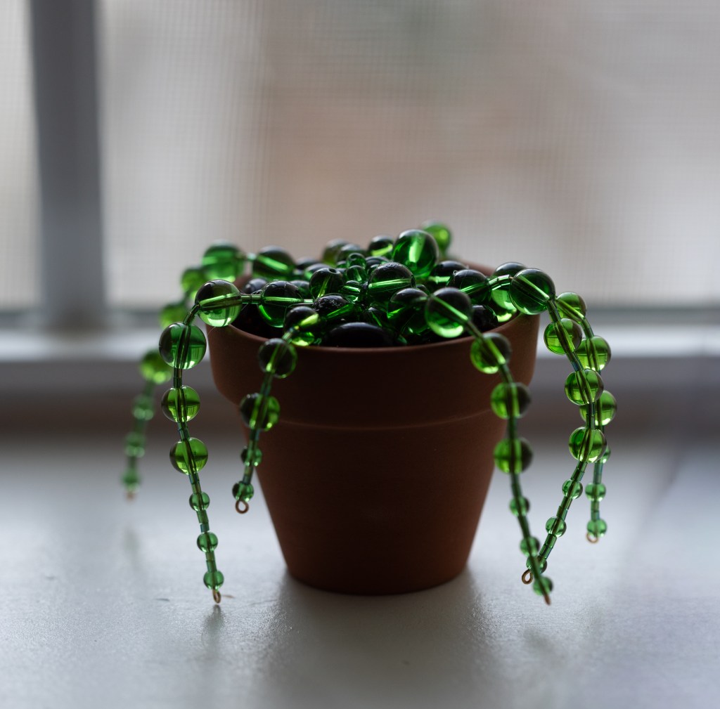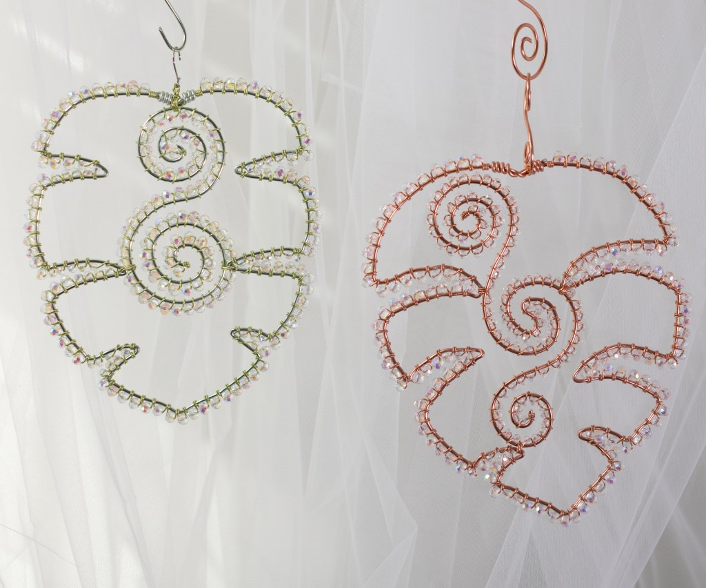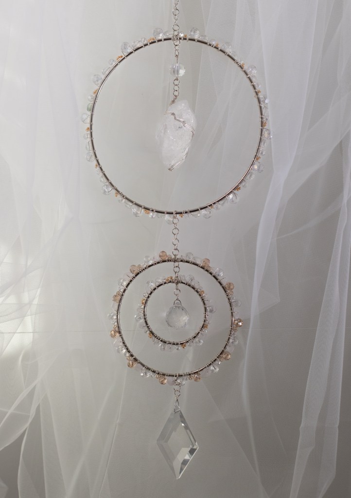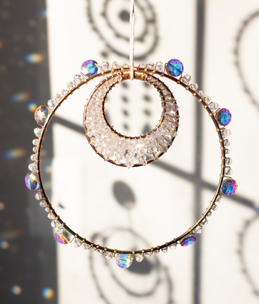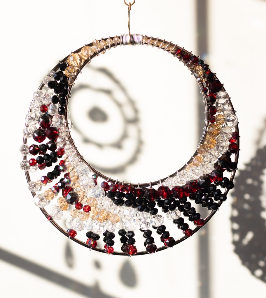Working with wire and glass beads allows me to slow down and be fully present. Each piece is designed and assembled by me; I’m drawn to how light transforms these unsuspecting objects into sparkly treasures